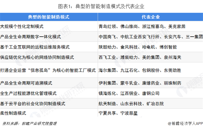 近幾年,工業和信息化部門持續組織實施智能制造試點示范專項行動,挑選出一批先行先試的試點示范項目,有效帶動了我國智能制造的發展。目前應用較為廣泛的有九大典型智能制造模式,分別是大規模個性化定制、產品全生命周期數字一體化、遠程運維、社會化協同、產品全生命周期可追溯、全生產過程能源優化管理、網絡協同制造及智能工廠模式。每種模式都有其代表性企業,例如,大規模定制化模式中,青島紅領、佛山維尚、浙江報喜鳥、美克家居為領先企業,在產品全生命周期可追溯模式中,伊利集團、蒙牛乳業、康緣藥業、麗珠制藥為主導企業。