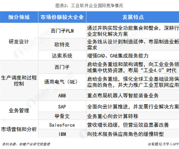 在設計軟件、實驗驗證軟件、生產流程信息化管理系統等相對終端較高軟件技術領域,西門子、博世、IBM、SAP、甲骨文、羅克韋爾等跨國公司已經占據市場主導地位;國產工業軟件多為標準化通用型產品,對產品定制和二次開發積累不足,導致難以滿足特定場景的需求。