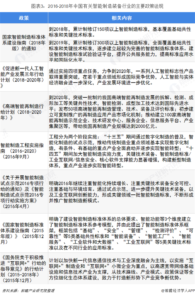 為改變國外企業在高級智能制造裝備上獨大的局勢,為增強和推動本國智能制造產業,國家相繼出臺多條行業政策助力發展。例如,2018年8月,工業和信息化部、國家標準化管理委員會共同組織制定了《國家智能制造標準體系建設指南(2018年版)的通知》,通知中明確指出到2019年,累計制修訂300項以上智能制造標準,全面覆蓋基礎共性標準和關鍵技術標準,逐步建立起較為完善的智能制造標準體系。建設智能制造標準試驗驗證平臺,提升公共服務能力,提高標準應用水平和國際化水平。