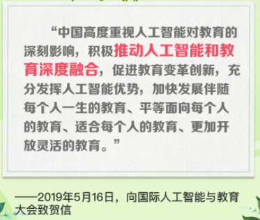 國(guó)際人工智能與教育大會(huì)上,習(xí)近平主題賀信中提到,要積極推動(dòng)人工智能與教育的深度融合,進(jìn)教育變革創(chuàng)新,要充分發(fā)揮人工智能優(yōu)勢(shì)。