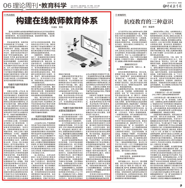 中國教育政策研究院常務(wù)副院長朱旭東、國家教育宏觀政策研究院副研究員高鸞撰寫了《構(gòu)建在線教師教育體系》一文,闡述了我國構(gòu)建在線教師教育體系的必要性、緊迫性,在線教師教育體系與傳統(tǒng)教師教育體系的差異以及構(gòu)建思路。文章刊發(fā)于《中國教育報(bào)》(2020年3月5日06版)