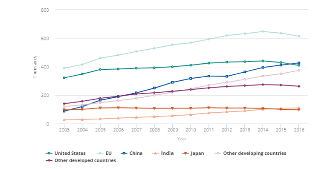 圖一是STEM教育在不同的國(guó)家的發(fā)展折線(xiàn)圖。我們看到桔紅的線(xiàn)和深藍(lán)色的線(xiàn),向上走的都是像中國(guó)以及印度這樣一些國(guó)家,那么我們可以看到根據(jù)教育的研究,這些國(guó)家他們都是目前發(fā)展非常快的國(guó)家,他們非常關(guān)注STEM的發(fā)展。
