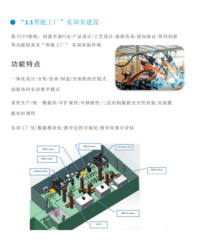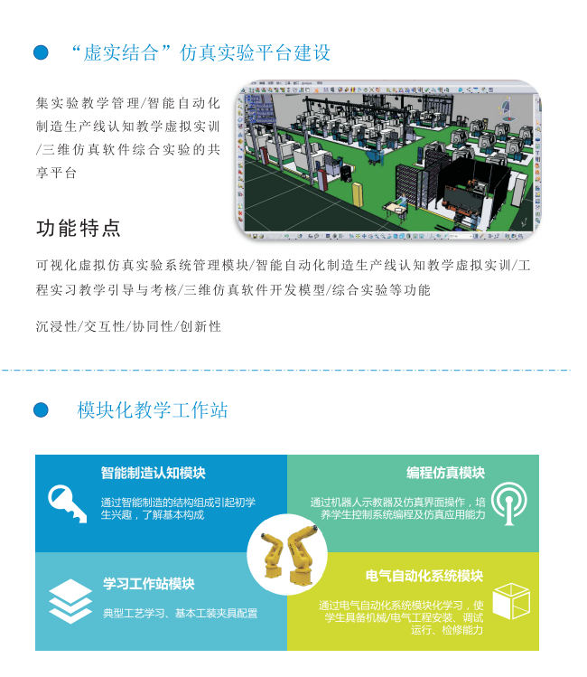 針對智能制造教育,為高等院校/中職院校全力打造智能制造創(chuàng)新教學(xué)體系建設(shè)(專業(yè)建設(shè)/師資培養(yǎng)/教學(xué)管理服務(wù)/資格證書認(rèn)定/協(xié)同創(chuàng)新教學(xué)環(huán)境搭建);提供“1:1智能工廠”實驗室/“虛實結(jié)合”仿真實驗平臺/數(shù)字資源及現(xiàn)代應(yīng)用技術(shù)實驗室建設(shè),實現(xiàn)從虛擬到現(xiàn)實的智能制造實訓(xùn)教學(xué)平臺。